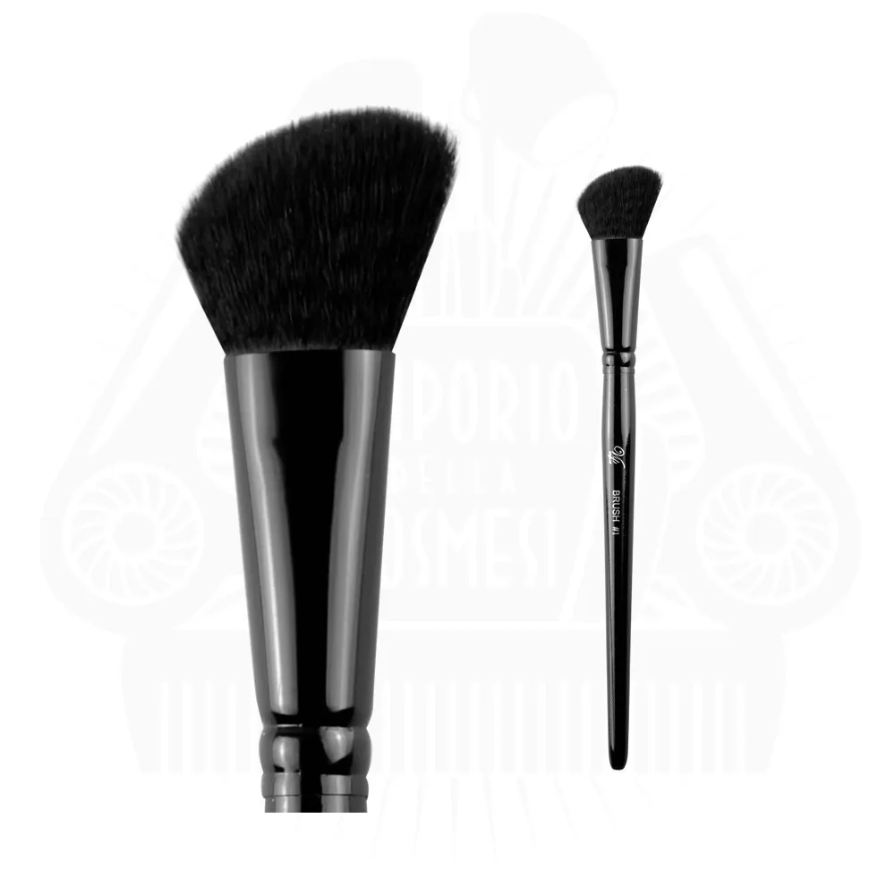 Pennello in setole naturali nere e con punta piccola obliqua a sezione piatta, permette una maggior definizione delle piccole aree del volto nell’applicazione delle polveri.